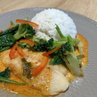 AVTENTIČNA TAJSKA JED S FILEJEM BELE RIBE, BROKOLIJEM, ŠPINAČO ALI BLITVO, KUHANA V KOKOSOVI-PANANG CURRY OMAKI.