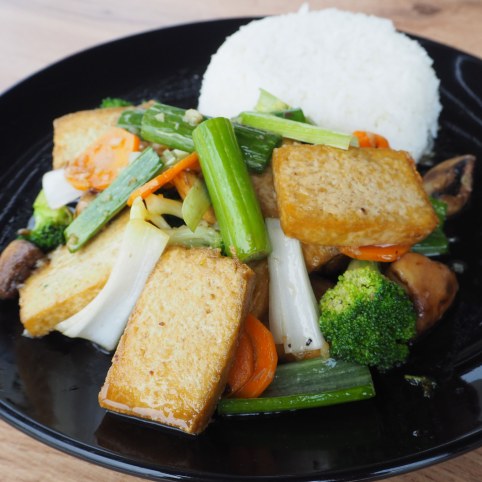 V VOKU PRIPRAVLJENA VEGANSKA TAJSKA JED, Z MEŠNO LOKALNO ZELENJAVO, MLADO ČEBULO, ČESNOM IN TOFUJEM ZAČINJENA Z OMAKO IZ ŠITAKE GOB SERVIRANA Z RIŽEM
