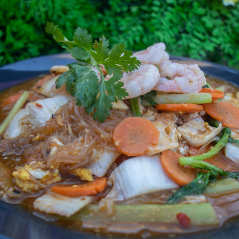 PRAŽENI TAJSKI RIŽEVI REZANCI V SOJINI OMAKI Z MEŠANO LOKALNO ZELENJAVO, ČESNOM IN JAJCEM