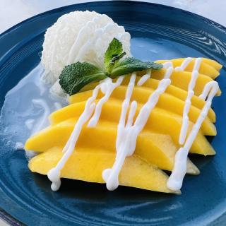 ZDRAVA TAJSKA SLADICA S SLADKIM LEPLJIVIM RIŽEM KUHANEM V KOKOSOVEM MLEKU, POSTREŽENIM S SVEŽIM NAREZANIM MANGOM IN SLASTNO KOKOSOVO OMAKO.