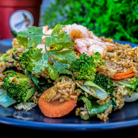 PRAŽEN RIŽ Z MEŠANO LOKALNO ZELENJAVO, ČESNOM, SOJINO OMAKO IN JAJCEM (po želji).